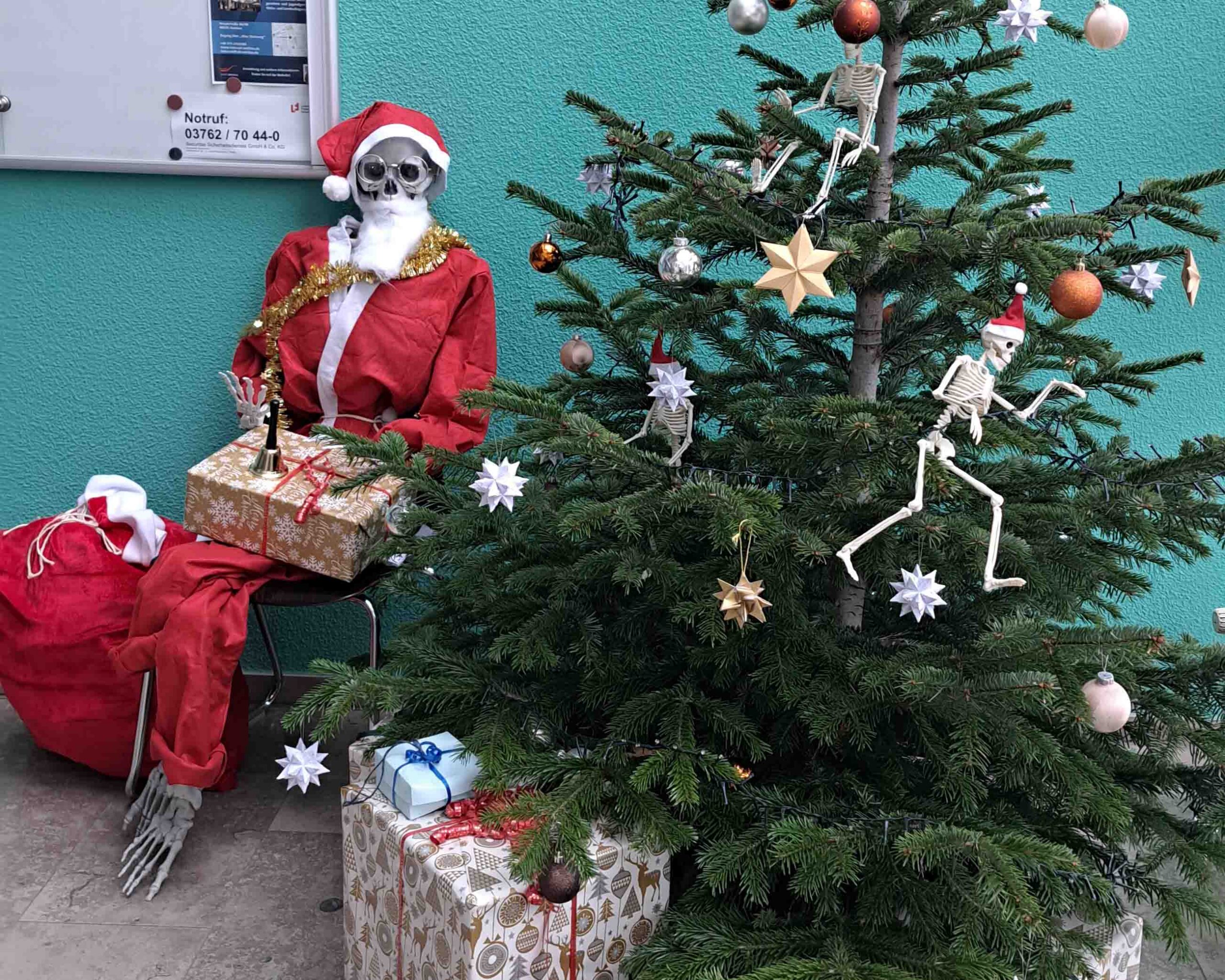 Weihnachtszeit ist Dekozeit! Auch in diesem Jahr haben sich die angehenden Ergotherapeut:innen der Ludwig Fresenius Schulen Zwickau etwas Besonderes einfallen lassen und ihrer Kreativität freien Lauf gelassen. So haben die Schüler:innen ein anatomisches Modell passend zur Vorweihnachtszeit einfach mal zu einem Weihnachtsmann umfunktioniert, welcher nun alle Gäste, die das Schulgebäude betreten, in Empfang nimmt.
