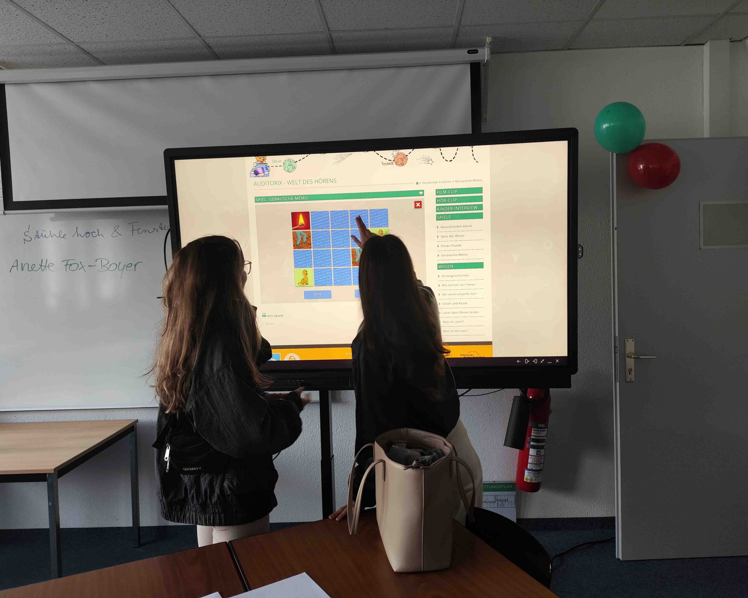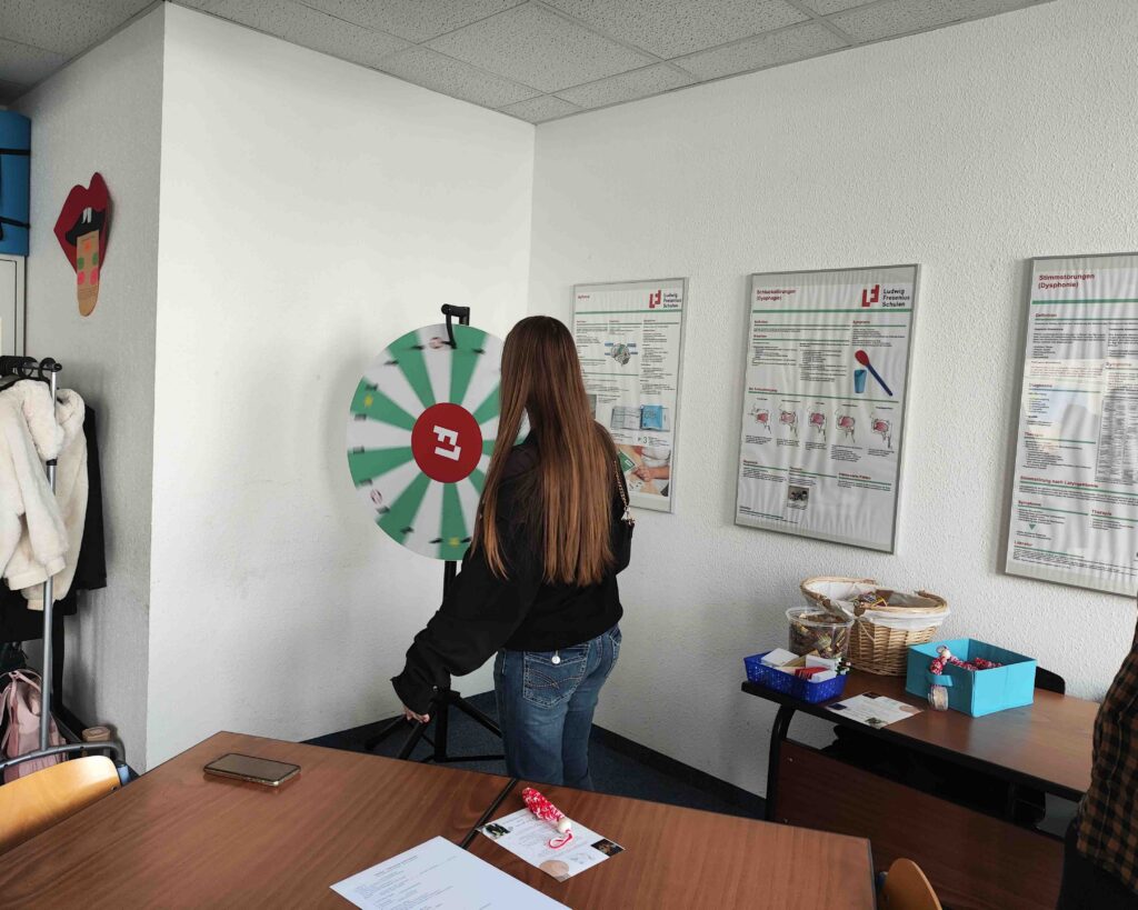 Während der Rundgänge konnten die Interessent:innen die Räumlichkeiten besichtigen und Fragen zu Unterricht, Praxisanteilen und Arbeitsalltag stellen. Außerdem erhielten sie Einblicke in Inhalte und Ablauf des Eignungstests. Dazu sorgten Wahrnehmungsspiele und ein Glücksrad für Abwechslung, was besonders bei jüngeren Gästen gut ankam.