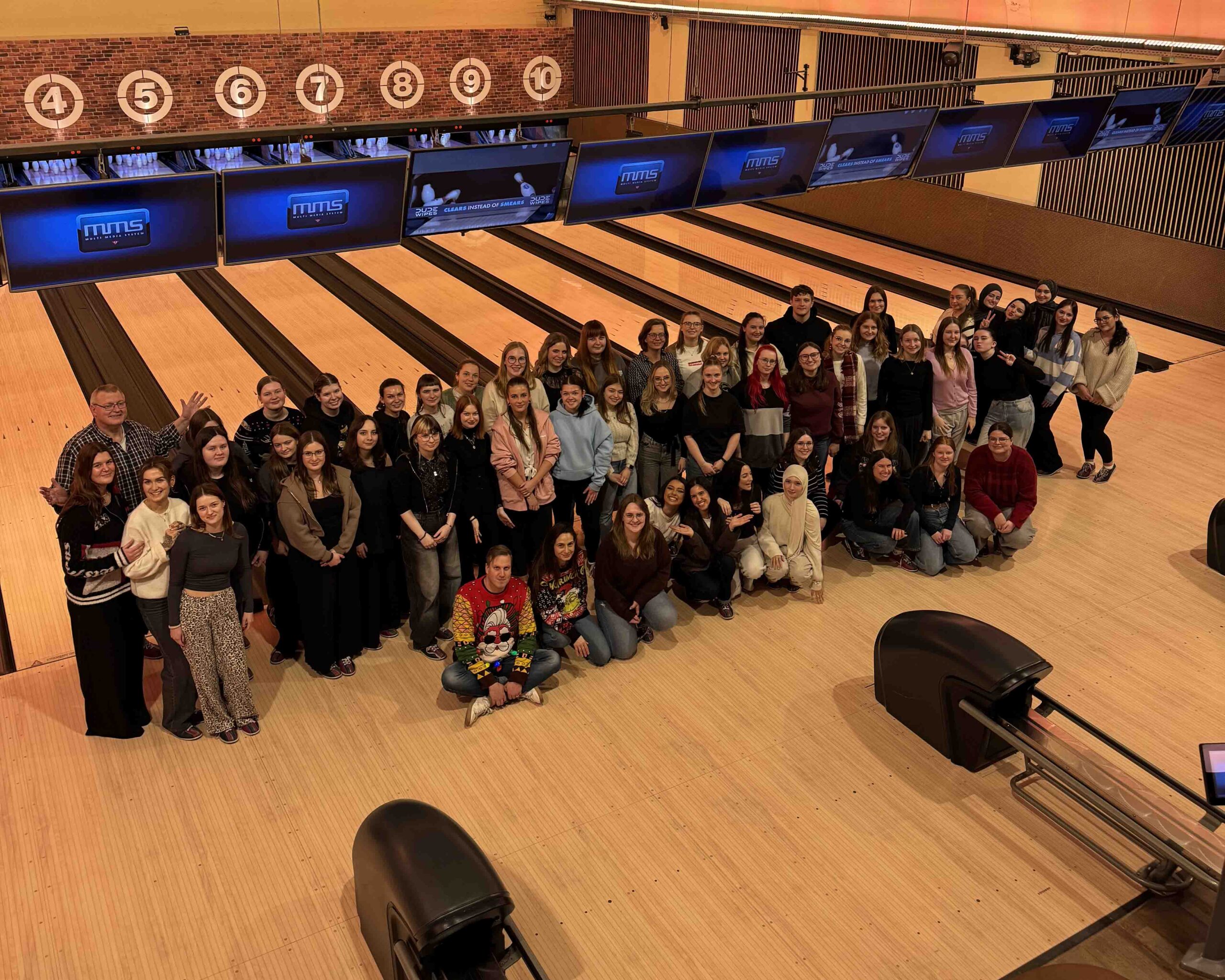Gemeinsam machten sich alle auf den Weg zur Bowlinghalle, wo bei weihnachtlichen Naschereien wie Lebkuchen, Spekulatius und Mandarinen gespielt wurde. Aus den erzielten Punkten wurde eine Bestenliste erstellt, wobei der Spaß und auch der Austausch untereinander natürlich im Vordergrund stehen. Das hilft vor allem dem neuen Unterkurs, der erst seit Oktober da ist, um die Mitschüler:innen besser kennenzulernen.