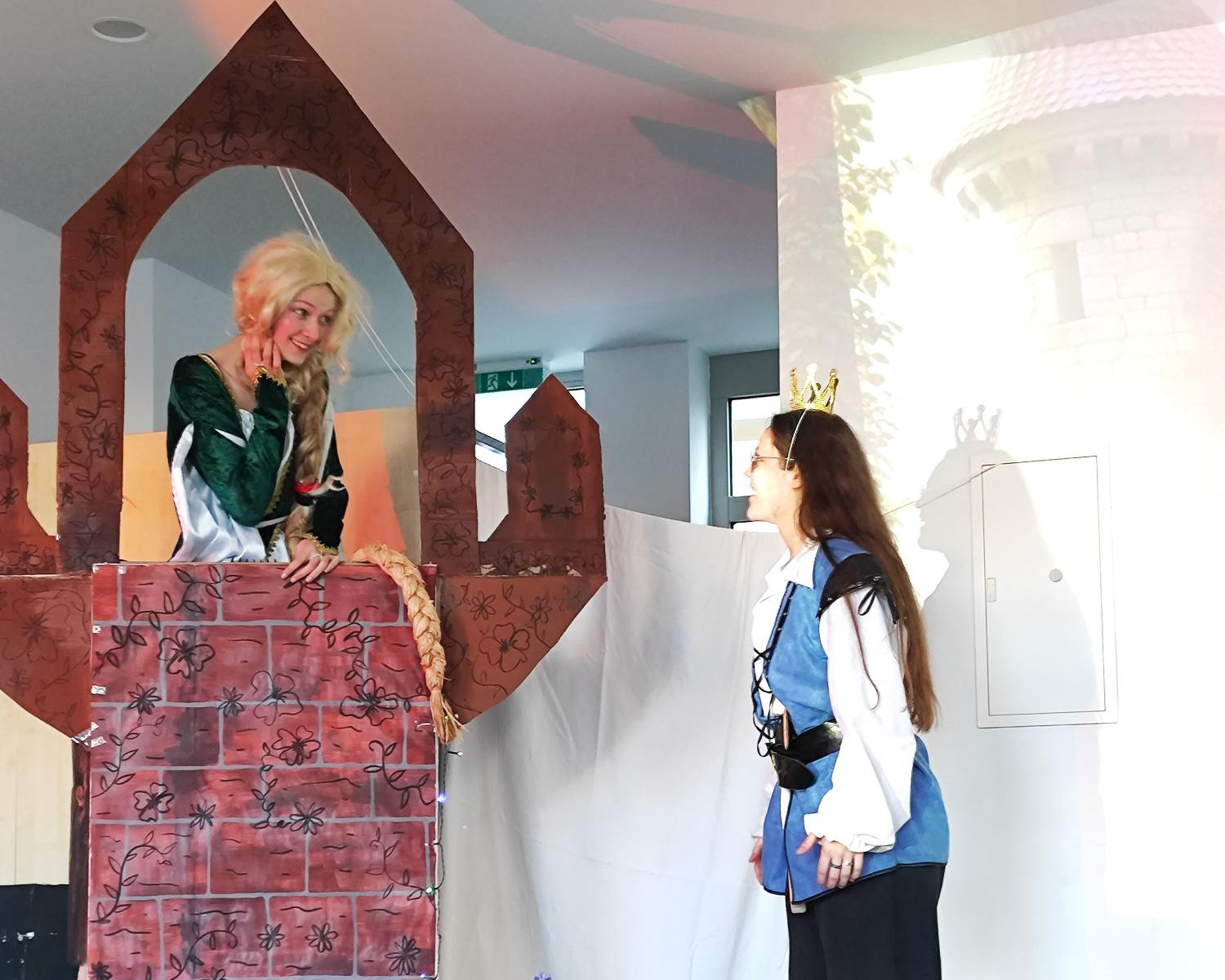 Danach teilten sich die Schüler:innen auf drei Märchen auf: Zur Auswahl standen Alice im Wunderland, Rapunzel sowie Hänsel und Gretel. Von Montag bis einschließlich Mittwoch arbeiteten die Gruppen an der Erstellung eines Skripts, der Rollenverteilung, der Gestaltung des Bühnenbildes mit Requisiten, der Kostümkreation und an intensiven Proben. Frau Tänzer sowie Schüler:innen, die als Märchenpat:innen fungierten, unterstützten die Gruppen dabei.