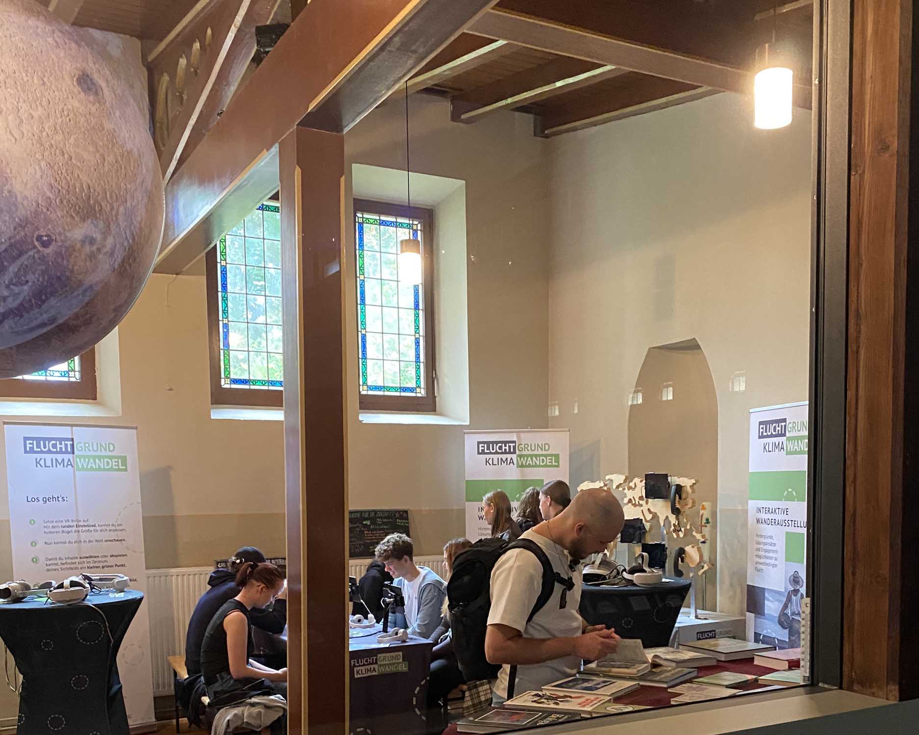 Sie lasen Berichte von Klimaflüchtlingen und sahen verschiedene bildlich dargestellte berechnete Szenarien zur Veränderung des Meeresspiegels durch das Schmelzen der Pole – außerdem wurde aufgezeigt, wie sich der Temperaturanstieg in den nächsten Jahrzehnten auf die Umwelt auswirken wird.