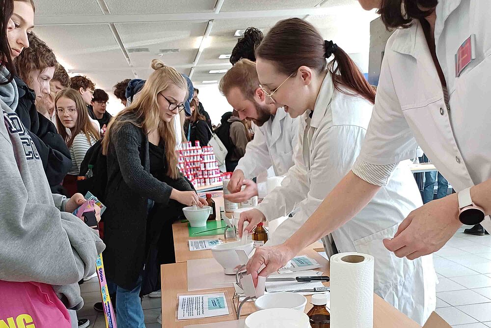 Für die mitgereisten PTA-Schüler war der „Tag der Pharmazie“ eine tolle Gelegenheit, ihr Wissen an Interessierte weiterzugeben und andere für die Ausbildung zu begeistern. Sie halfen aber nicht nur am PTA-Informationsstand aus, sondern unterstützten auch die Apotheker beim Stand zur Arzneimittelherstellung. Hier präsentierten sie anschaulich, wie Arzneimittel angefertigt werden. Für ihre eigenständige und engagierte Arbeitsweise erhielten sie dabei von den Apothekern großes Lob.
