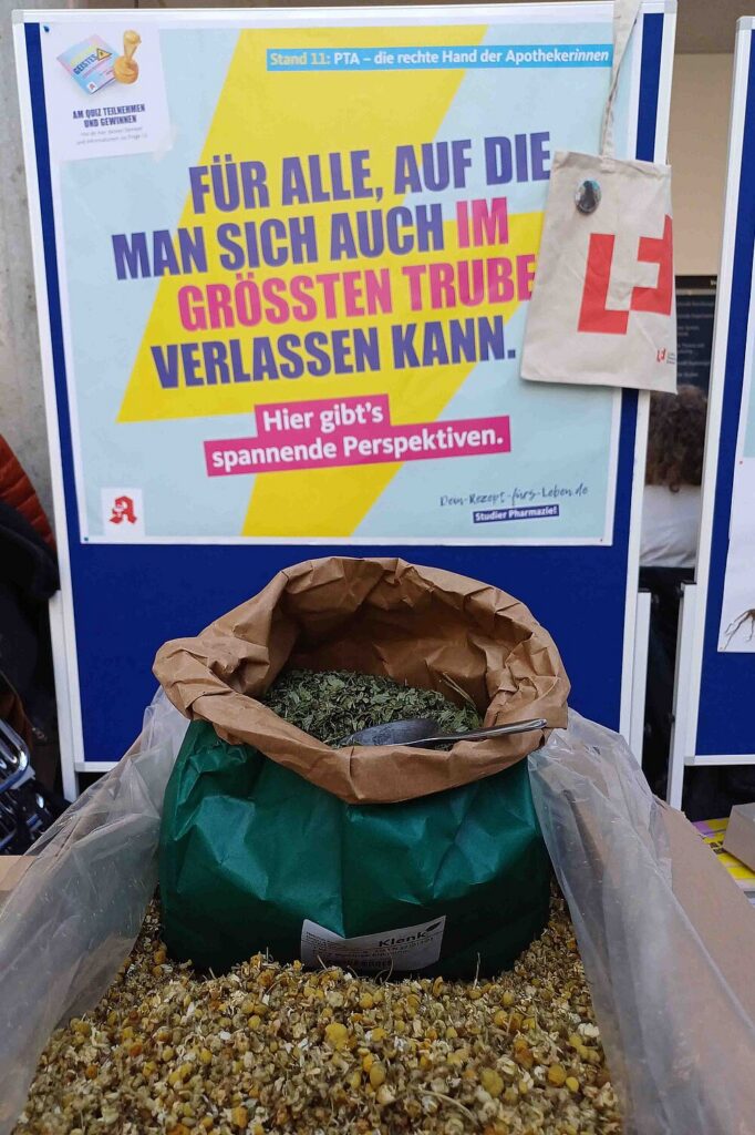 Am Stand der Ludwig Fresenius Schulen konnten sich die Besucher in einem Quiz einen Überblick über das Berufsbild und die Ausbildung von Pharmazeutisch-technischen Assistenten verschaffen. Mitmachaktionen wie eine mikroskopische Ausgangsstoffprüfung von Kamillenblüten sowie das Anfertigen von Teemischungen und Salben gaben einen praxisnahen Einblick in das berufliche Tätigkeitsfeld. Eindrücke der Ausbildung vermittelten mikroskopische Zeichnungen, selbstgestaltete Plakate, Herbarien und Praktikumstagebücher, die von den PTA-Schülern der Ludwig Fresenius Schulen Mühlhausen und Erfurt angefertigt wurden.
