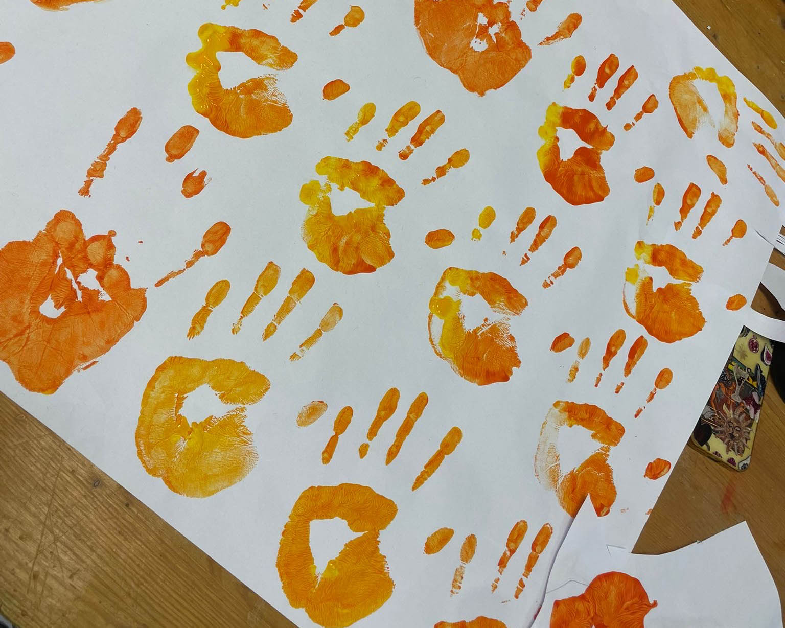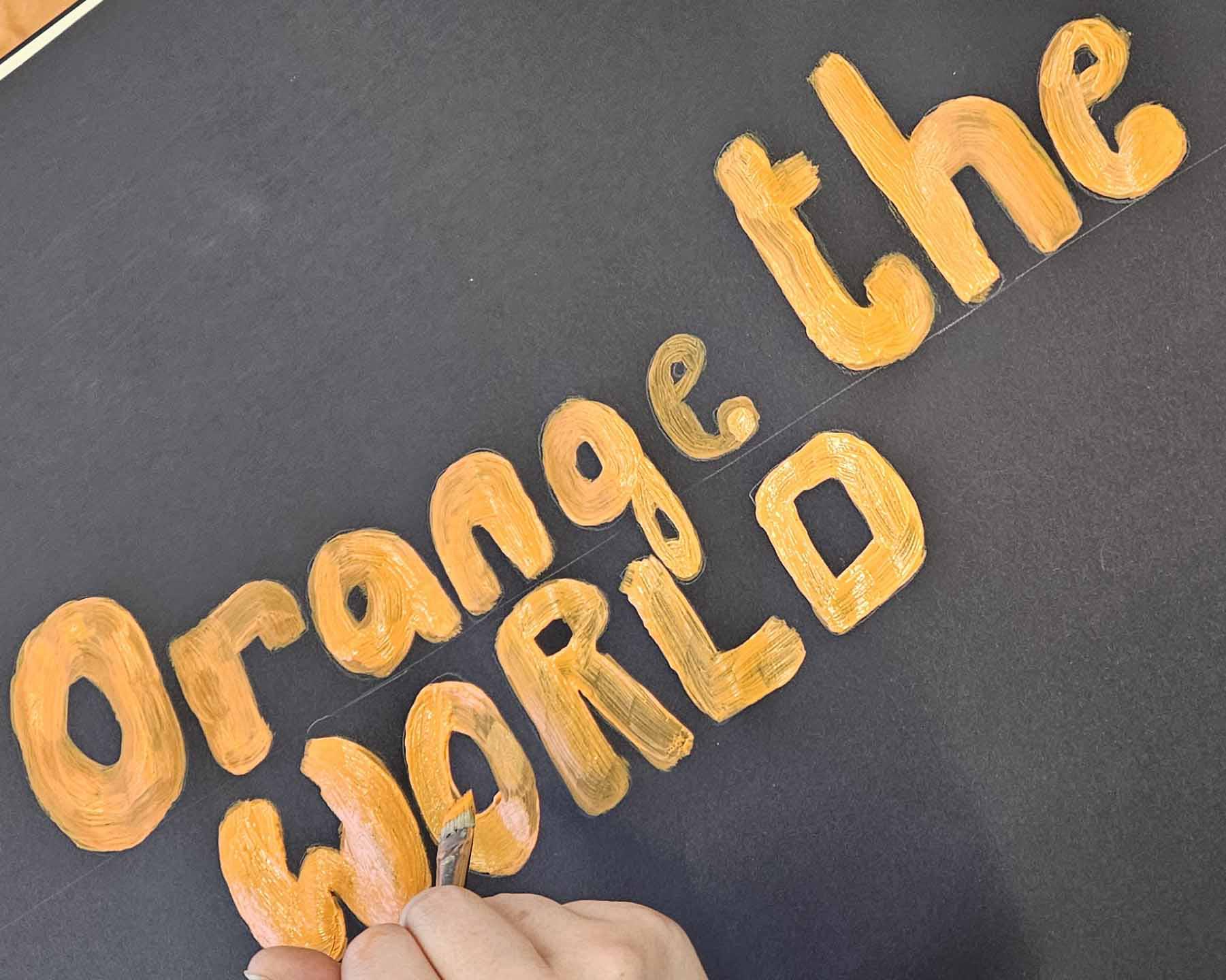 An den vielen Fenstern der Schule wurden mit Handabdrücken in orangener Farbe verziert. Diese sollen zeigen, dass an unseren Schulen Gewaltprävention ernstgenommen wird. Die Handabdrücke symbolisieren Unterstützung und Solidarität für Betroffene. Auf den Fluren bereiteten Schüler:innen und Lehrkräfte themenbezogene Plakate mit Informationsmaterial zu Themen wie Gewalt in der Partnerschaft, sexualisierter Gewalt, Zwangsheirat, Kinderheirat und digitaler Gewalt auf. Auch Informationen zu Prävention, Hilfsangeboten und dazu, wie man selbst helfen kann, wurden gut sichtbar verteilt.