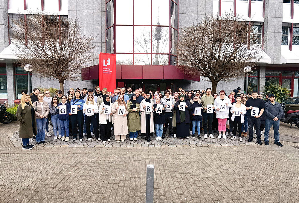 Die Botschaft war klar und deutlich: An den Ludwig Fresenius Schulen Dortmund, die im Dezember 2022 als „Schule ohne Rassismus – Schule mit Courage“ ausgezeichnet wurden, haben jegliche rassistische Tendenzen keinen Platz. Besonders im Hinblick auf die aktuellen Kriege im Nahen Osten und in der Ukraine sind antisemitische und fremdenfeindliche Äußerungen und Taten aktueller denn je. Umso wichtiger war es den Beteiligten, sich klar zu positionieren. So stellten sich Schüler und Lehrer vor dem Schulgebäude für ein Foto auf und hielten ausgedruckte Buchstaben in die Kamera, die zusammengesetzt ein unmissverständliches Statement ergaben: „Gegen Rassismus“.